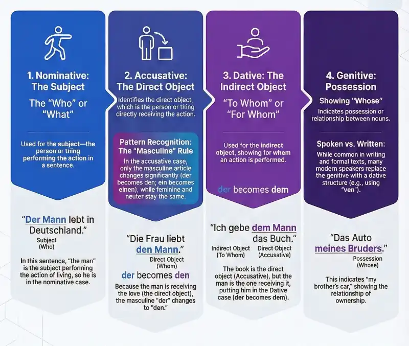 The accusative case is used for the direct object, the person or thing that directly receives the action.